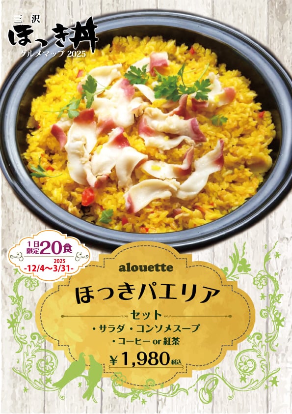 カフェ あるえっと トップページ > カフェ あるえっと 新着情報 一覧へ戻る 『あるえっとほっきパエリア』はじまります!2024-12-10 いつも『カフェ あるえっと』のご利用誠にありがとうございます。 グルメマップ2025-26 三沢ほっき丼が今年も開催されました。この時期にしか味わえない『あるえっとほっきパエリア』をご賞味下さい。2025/12/6~2026/3/31まで あるえっとほっきパエリア 限定20食●単品 ¥1,980(税込)●セット ¥2,310 税込 〇サラダ〇コンソメスープ 〇コーヒーor紅茶ほっき貝と魚介のエキスをお米がしっかりと吸収し、しっとり焚きあがった部分とパリッと香ばしいおこげのバランスが絶妙!スパニッシュで深みのある逸品です。 皆様のご来店を心よりお待ちしております。